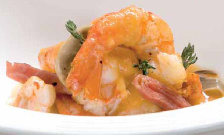 Para la presentación del plato realizaremos una cama sobre la cual colocamos los langostinos que cubriremos con la salsa, y como decoración le colocamos encima una rama de perejil.