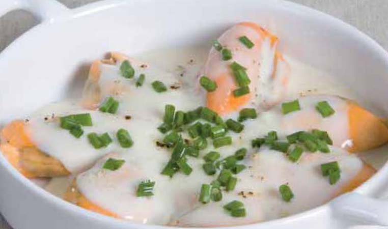 Ponemos en un recipiente a fuego lento la mantequilla y una vez derretida añadimos la harina. Es importante mezclar bien para que no queden grumos. A continuación vamos añadiendo leche poco a poco sin dejar de remover, hasta llegar a obtener el espesor deseado. Seguidamente salpimentar y condimentar con un poco de nuez moscada. Añadir las almendras a la bechamel mezclando todo bien. Cubrimos los mejillones con la bechamel y los dejamos gratinar en el horno.