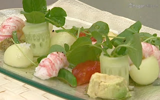 Ponemos en el plato, todo esparcido, pequeños montoncitos de mojo, judías verdes, semillas de tomate, trozos de aguacate, bolas de melón, cigalas, rollitos de pepino y unas hojitas de berros. Aliñar con la vinagreta y espolvorear con unos cristales de sal.
