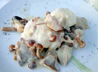 Enrrolla los filetes de merluza y pínchalos con una brocheta poniendo al final un buen gambón. Saltea en una sartén una chalota bien picadita con el medio diente de ajo prensado, tres cucharadas de aceite de oliva, el perejil, el puerro y sal y remover. Añade el vino blanco y la nata dejando 10 minutos. Si no está hecha, deja también el tiempo de la setas. Incorpora las setas bien escurridas y la sal dejando otros 5 minutos sin tapa para que se evapore. Servir!!
