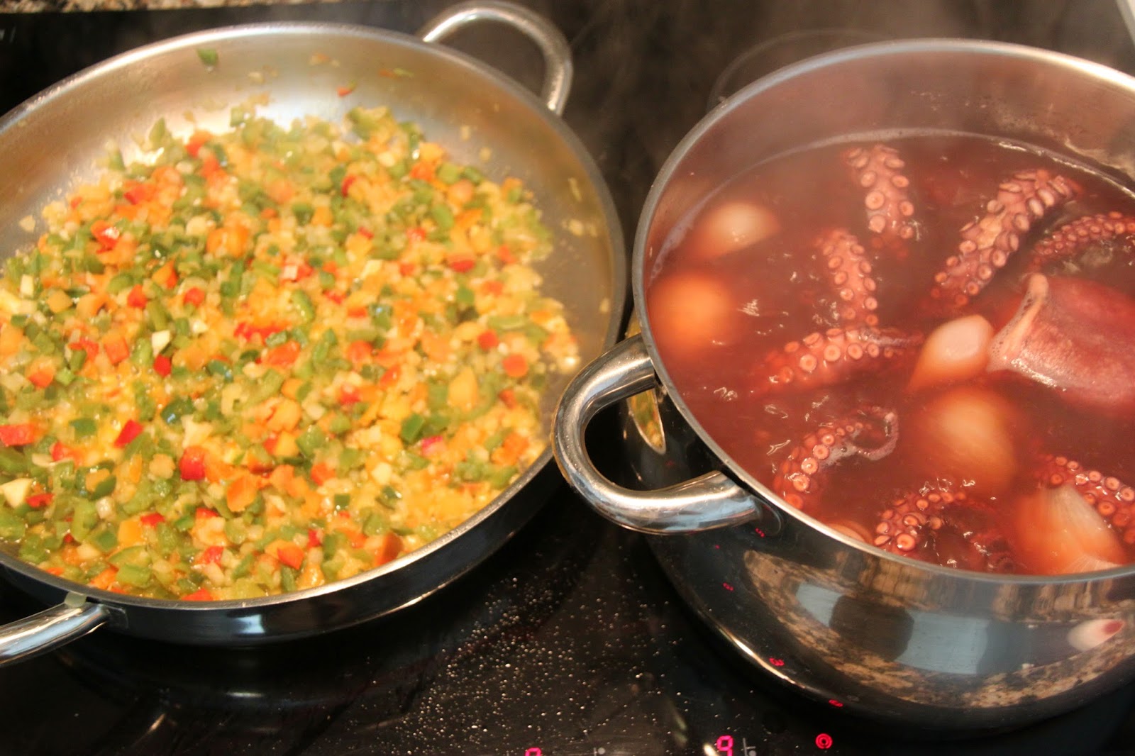 9. Añadimos al sofrito ya guisado y en su punto, el pulpo y las patatas, Dejamos hacer 10 minutos más todo junto para que se mezclen los sabores.