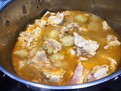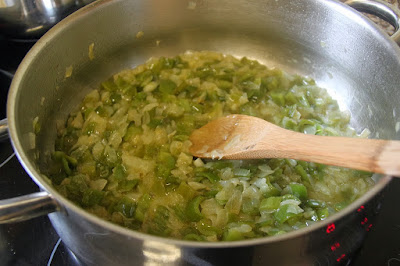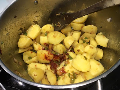 4. Cuando estén las verduras en su punto, añadimos las patatas amarillas, peladas y cascadas en trozos algo más grandes que los de bonito. Las rehogamos un buen rato con la verdura. Es muy importante, para que espese el guiso, que las patatas sean cascadas y no totalmente cortadas.
