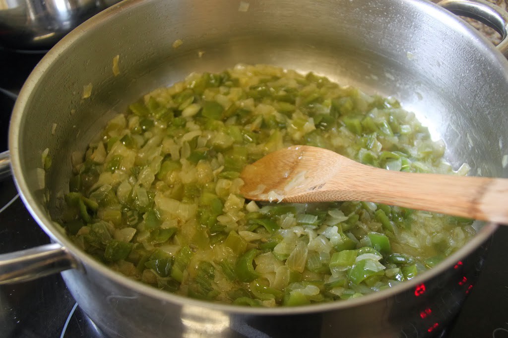 4. Cuando estén las verduras en su punto, añadimos las patatas amarillas, peladas y cascadas en trozos algo más grandes que los de bonito. Las rehogamos un buen rato con la verdura. Es muy importante, para que espese el guiso, que las patatas sean cascadas y no totalmente cortadas.