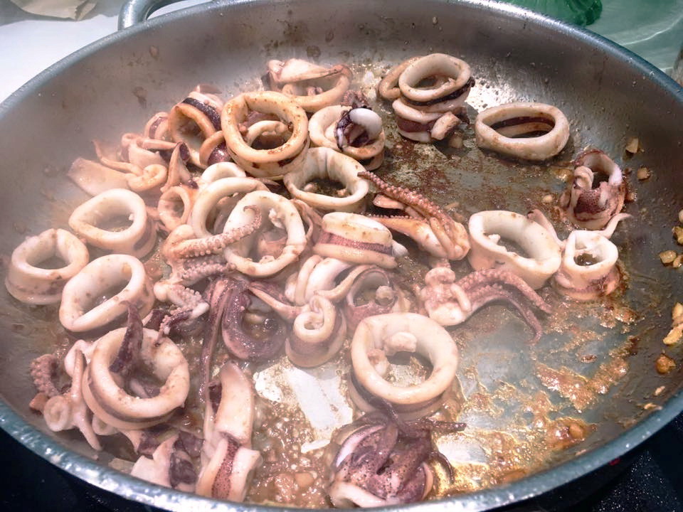 2. En ese aceite sobrante, rehogamos los ajos picados muy menudos y a continuación, los calamares limpios y cortados en anillas. Los dejamos hacer unos 10 minutos removiendo bien para que no se peguen.