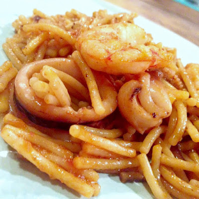 4. A los fideos ya bien salteados, les añadimos la cucharada de pimentón, el azafrán y removemos bien y rápido para que no se queme el pimentón.