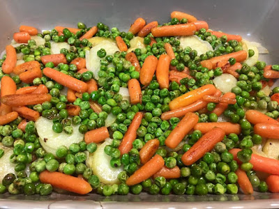 4. En la misma sartén y en un fondito de aceite, salteamos los guisantes y zanahorias. Cuando estén “al dente” los colocamos sobre las patatas.