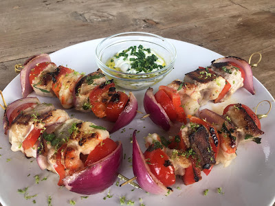 Insertamos en unos palitos de brocheta medianos los trozos de atún, las hortalizas cortadas y los gambones, tal y como se muestra en la foto.