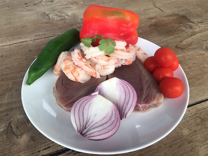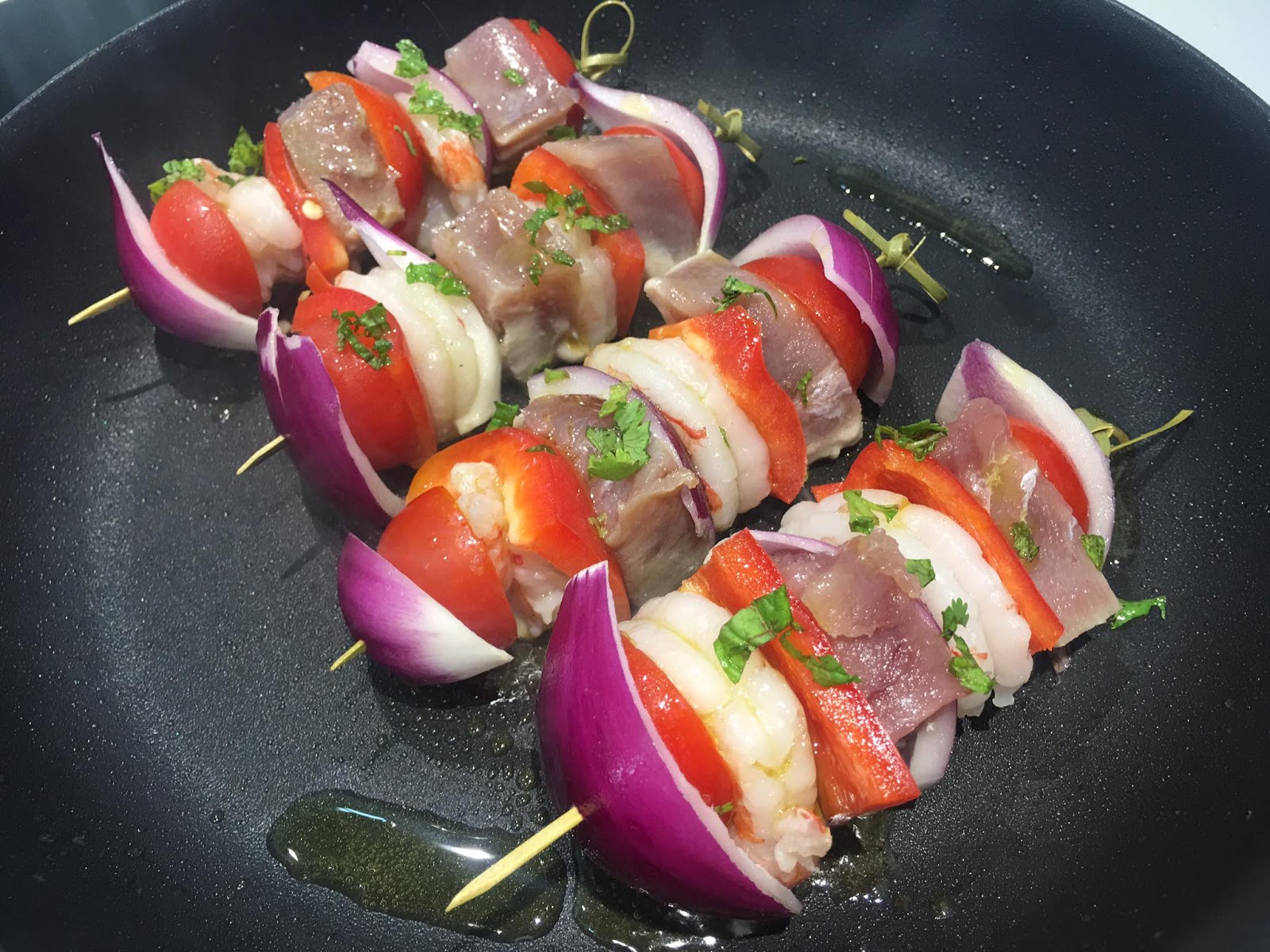 Insertamos en unos palitos de brocheta medianos los trozos de atún, las hortalizas cortadas y los gambones, tal y como se muestra en la foto.