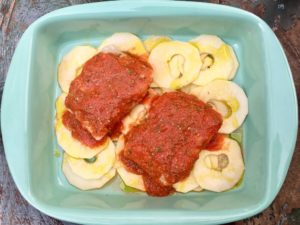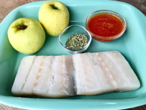 6. Sobre las manzanas, colocamos el bacalao que teníamos reservado y lo cubrimos con la salsa de tomate mezclada con el orégano.