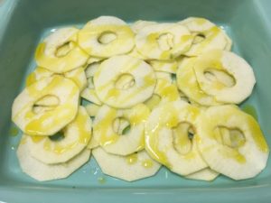 5. Cubrimos con las manzanas el fondo de una fuente de horno y aderezamos con aceite virgen y sal.