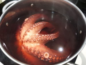 Con el agua caliente, introducimos y sacamos 3 veces el pulpo, técnica esta que dice la leyenda sirve para que el pupo no pierda la piel.