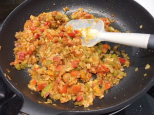 Mientras, ponemos el sofrito congelado en una sartén al fuego. Poco a poco se descongelará y soltará todo el líquido. Una vez seco y en la misma sartén, añadiremos el aceite de oliva virgen y la sal.. Dejamos pochar normalmente. Añadimos pimentón al gusto.