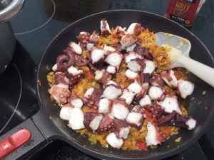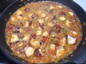 Cortamos el pulpo en rodajas gruesecillas y lo añadimos al sofrito. Incorporamos un poco de líquido de la cocción y lo dejamos guisar todo junto unos 15 minutos. Si se consume el líquido añadimos más.