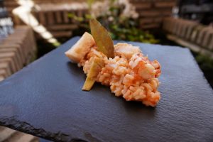 Ponemos a calentar en un perol una cucharada de aceite de oliva virgen extra. Una vez que el aceite esté caliente, añadimos el ajo y la cebolla y rehogamos. Posteriormente añadimos los pimientos y volvemos rehogar la mezcla durante unos 5 minutos aproximadamente. Una vez pasado ese tiempo, añadimos a la mezcla el tomate triturado, las alcachofas, las guindillas, la hoja de laurel y la pimienta negra. Rehogamos la mezcla a fuego medio durante unos 20 minutos. El siguiente paso será añadir el arroz y volver a rehogar durante 2 minutos. A continuación, vertemos el caldo del pescado y sal al gusto. Cocemos a fuego medio durante otros 20 minutos. Una vez el arroz esté listo, apartamos del fuego y añadimos la merluza y los langostinos. Tapamos la mezcla con una tapadera durante unos 5 minutos para que se cueza la merluza y los langostinos.