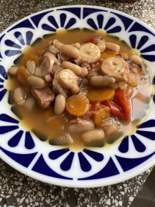 Cocemos las habas con 1 zanahoria, 1 cebolla, el laurel, sal y pimienta.