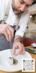 Emplatado – Cocer la merluza en vaporera 8 minutos. Emplatar y poner encima del guiso de acelgas. Salseamos con la crema de castañas y colocamos las pencas encurtidas.